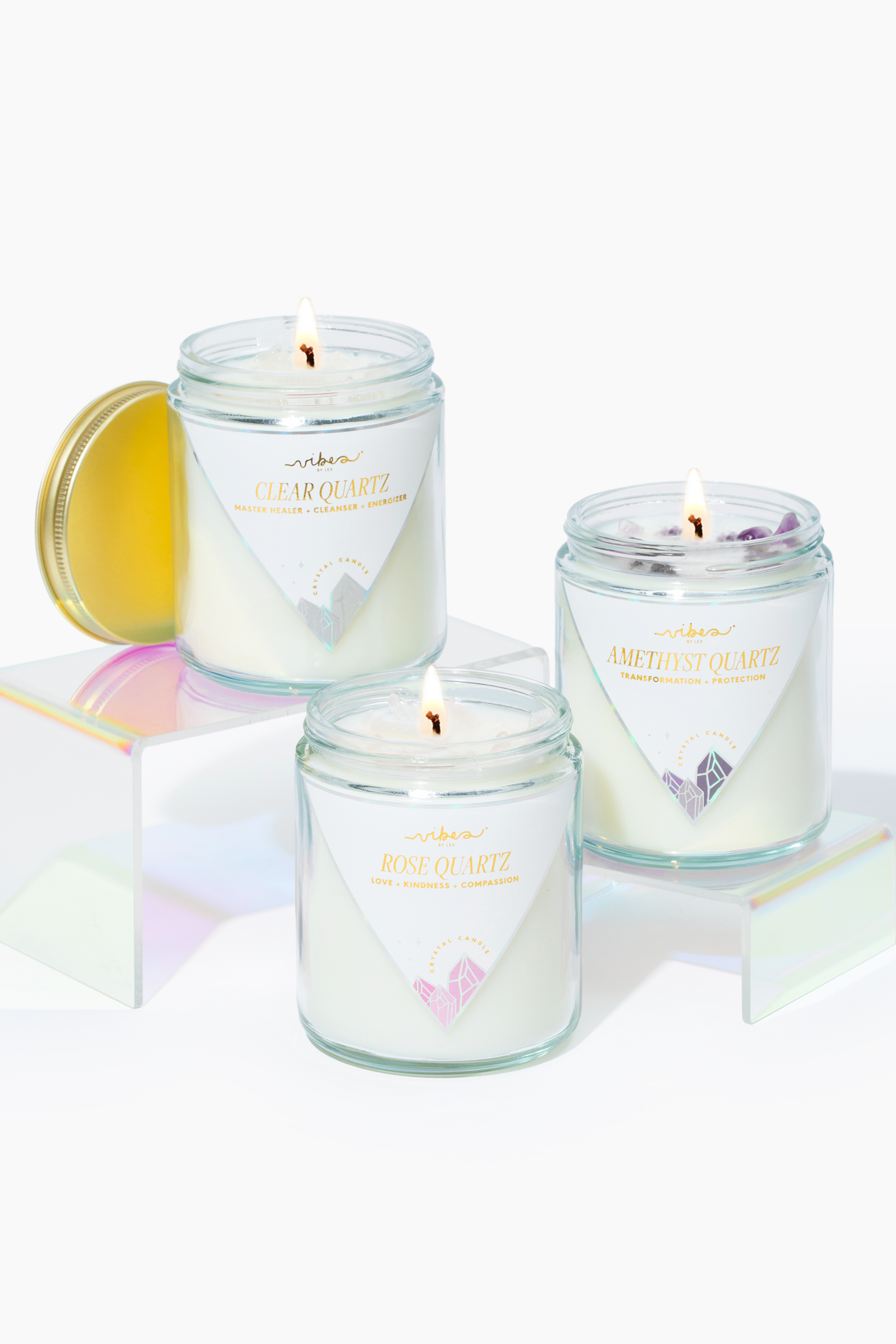 Vibes Candles unique soy wax blend is hand-poured into a 8oz clear glass vessel with a gold screw top lid and adorned with our gold foiled branded label. Our biodegradable and plant-based fiber cotton wick allows you to enjoy fragrance throw for 45+ hours. Our candles are hand-poured in our storefront in Marlborough, Massachusetts and have hand placed crystals inside. Our products are free of phthalates, parabens and sulfates and are never tested on animals.